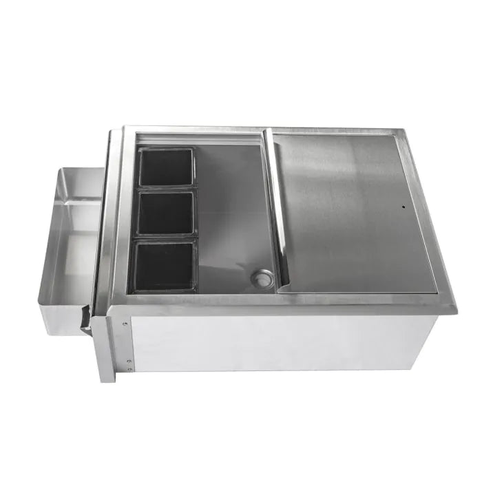 The Barbeques Galore Outdoor Bar gives you stainless steel storage for all your refreshments. The front tray holds bottles and cans and features a convenient bottle opener. A covered ice tray with drain and three covered condiment trays round out this great addition.
