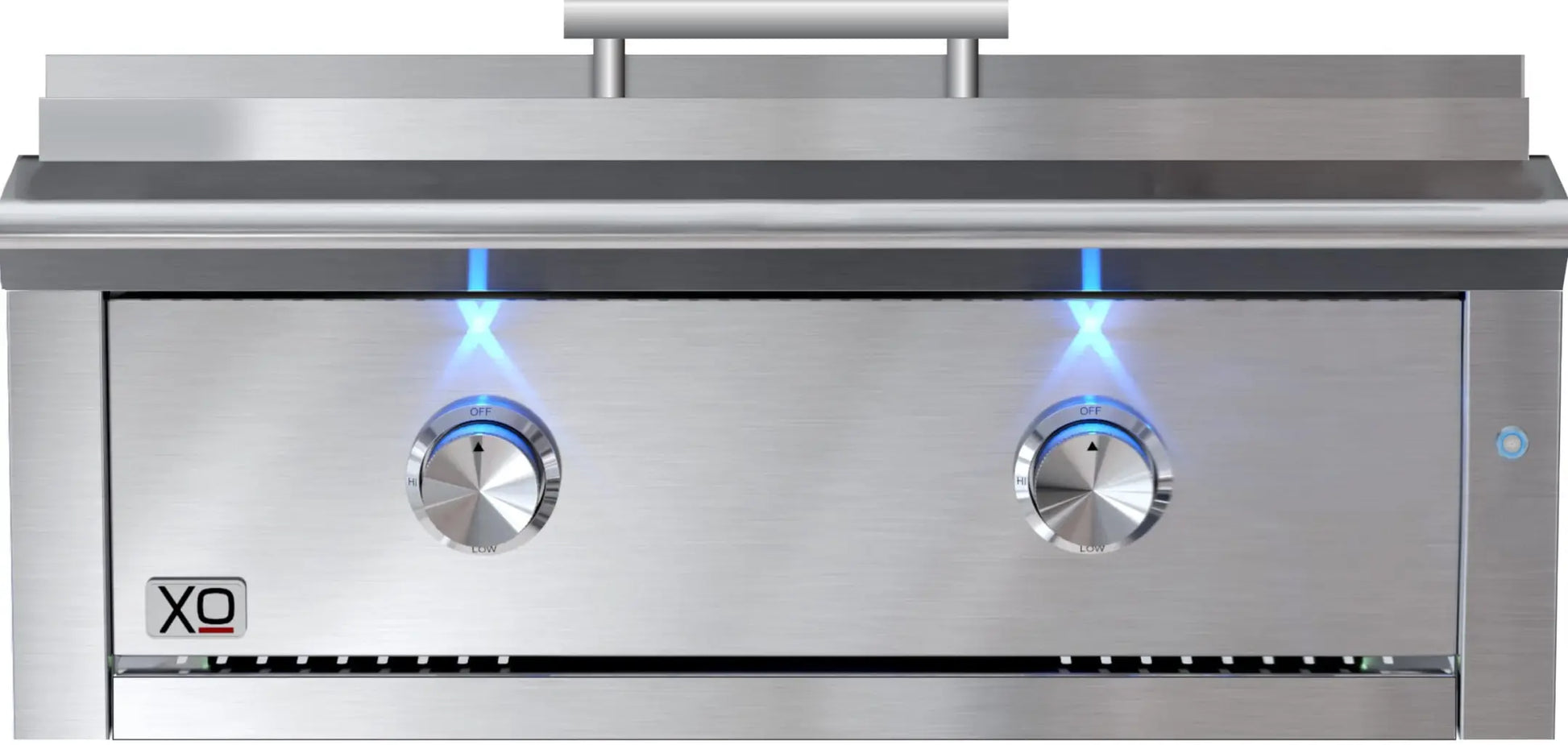 The amazing versatility of the XO Pro-Grade luxury griddle allows you to cook up dishes not possible on your ordinary grill. Sizzling fajitas, fried rice, caramelized onions, smashed burgers and veggies for the whole family. Features signature LED control knob illumination. The XO Pro-Grade built-in griddle is equipped with two commercial quality, 304 stainless steel U-shaped burners that each deliver 18,000 BTUs of cooking power for a total of 36,000 BTUs across the 495 square inch stainless steel cooking surface.